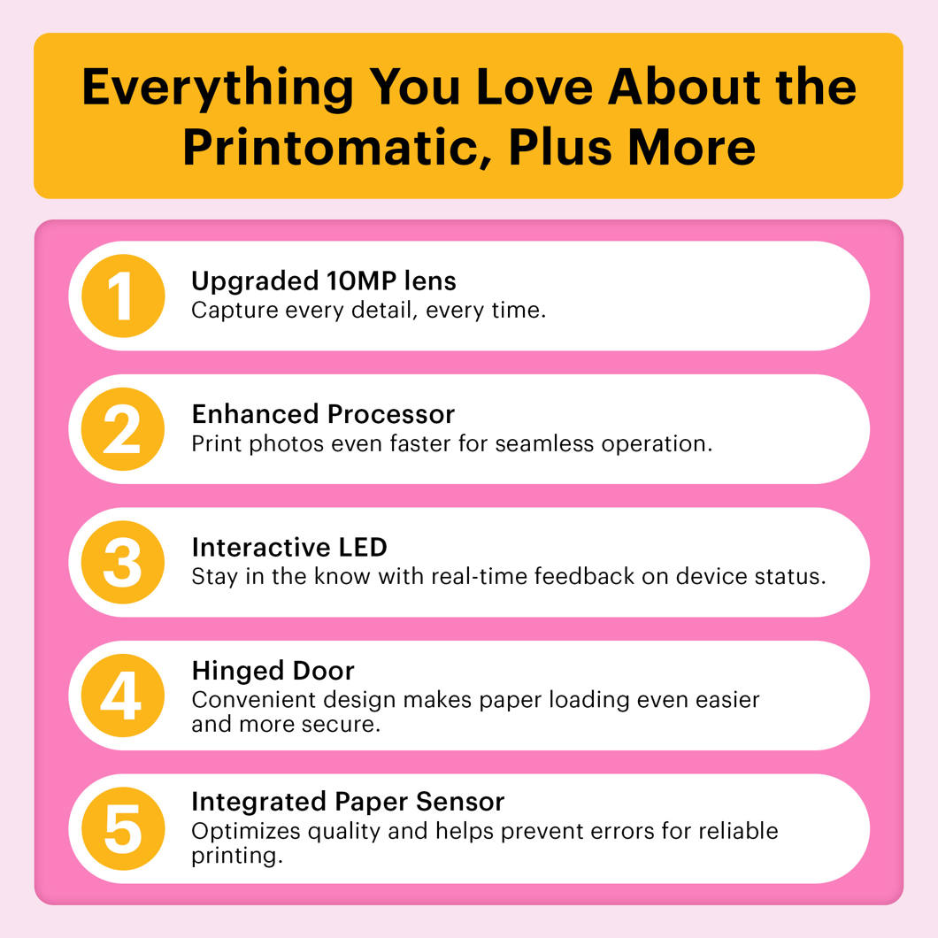 The Kodak Printomatic+ is designed to capture everyday moments as they happen, this pocket-sized instant camera lets you take a photo and watch it print instantly — no ink, no waiting. Equipped with a 10mp sensor and a wide-angle lens, printomatic+ delivers bright, clear images wherever you are. automatic flash and simple point-and-shoot operation ensure great results both indoors and outdoors, so you can focus on the moment instead of the settings.