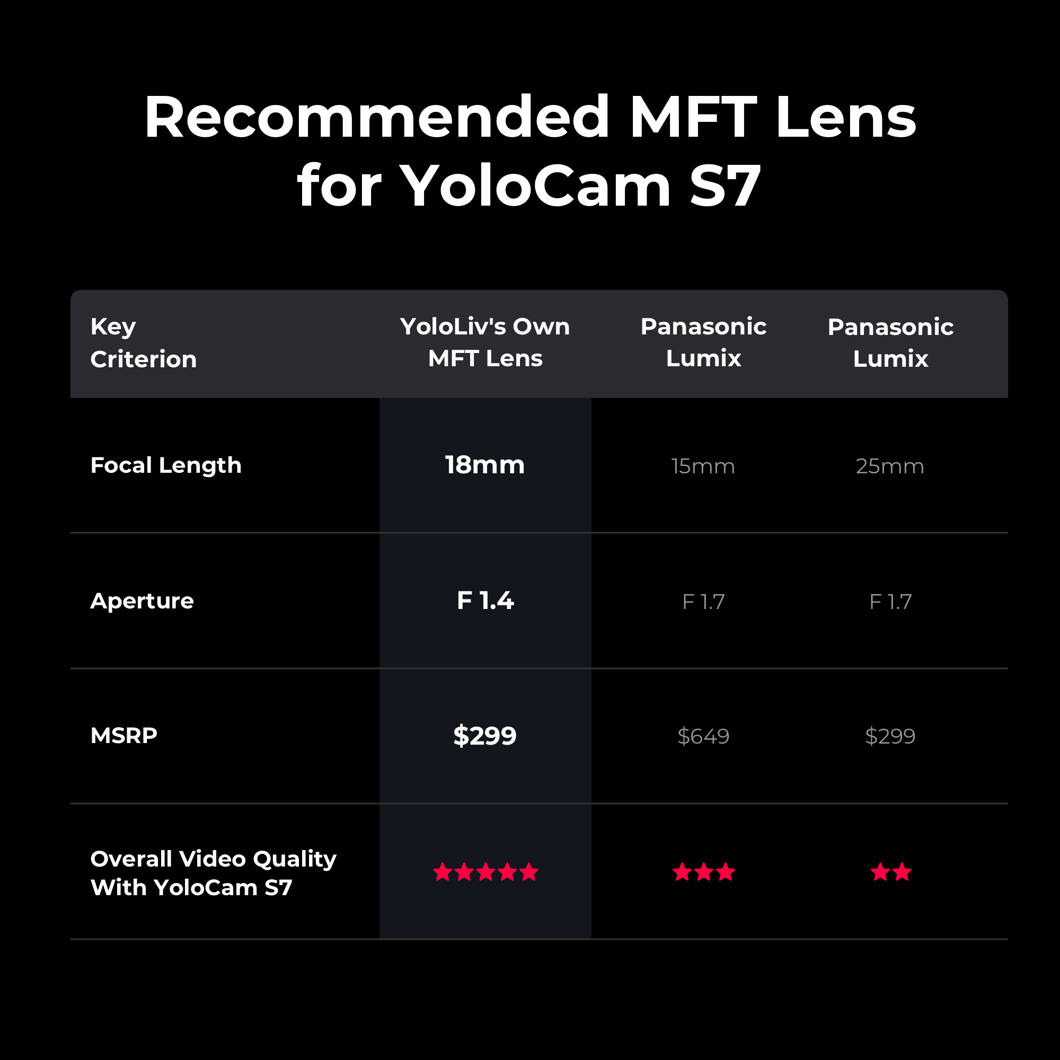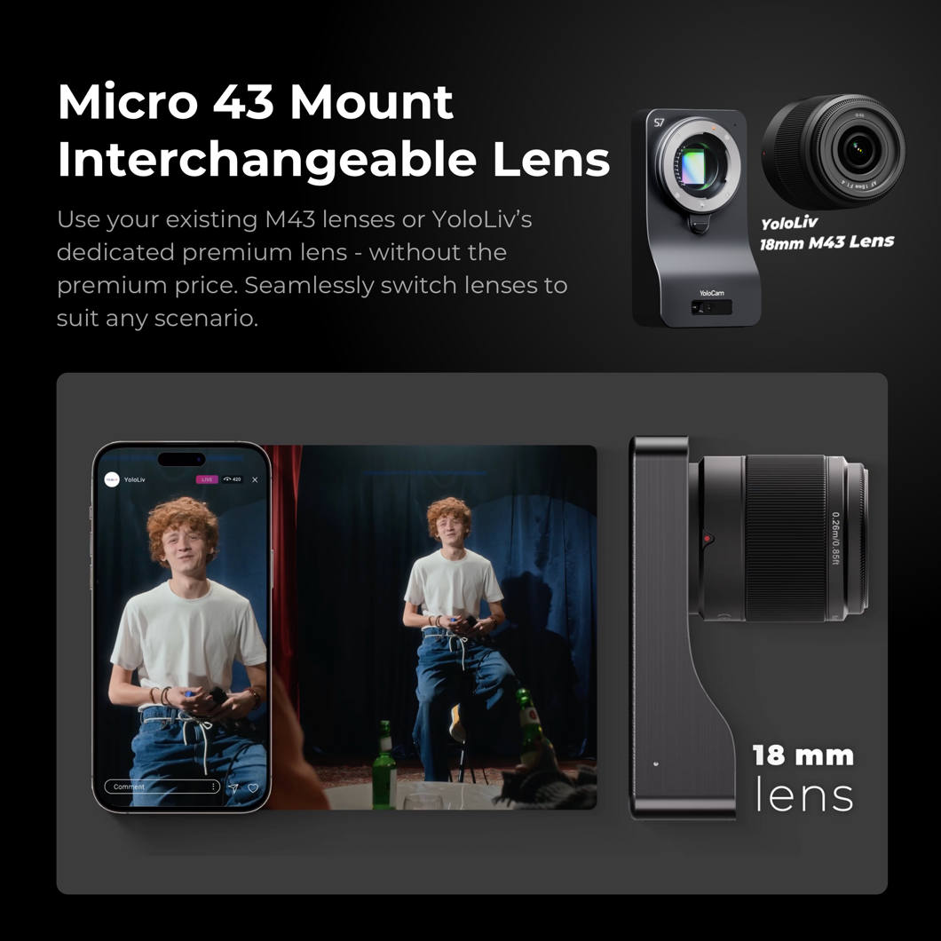 The YoloLiv Lens is an 18mm F1.4 M43‑mount lens featuring a bright, large aperture for smooth background blur and professional image quality. It’s designed to deliver a compact, immersive shooting experience with YoloCam S7.